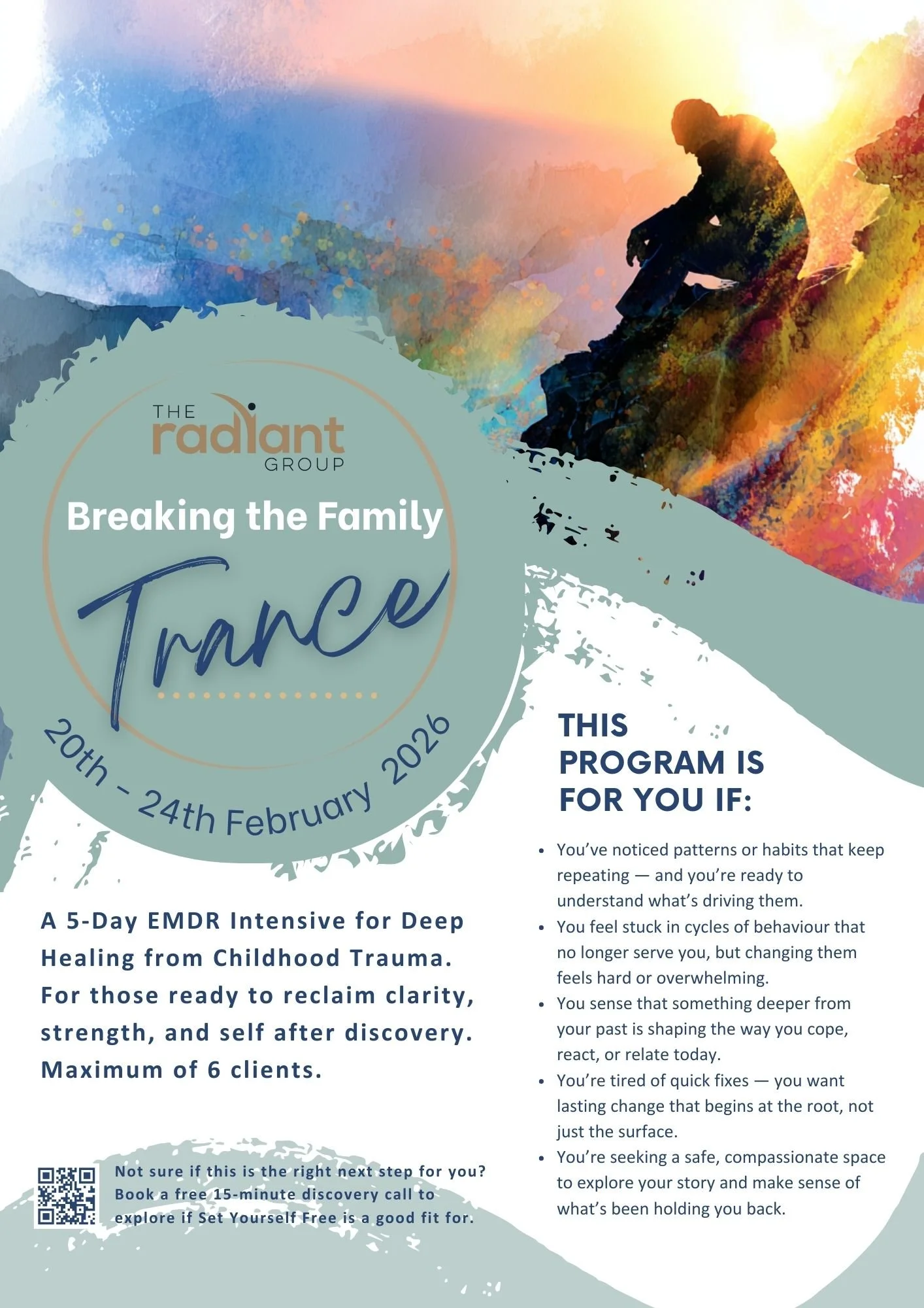 Breaking the Trance is a 5-day EMDR intensive for those ready to transform long-held patterns shaped by early experiences. Through compassionate, trauma-informed care, the program addresses self-protective responses, restores nervous system balance, and supports lasting emotional integration and self-leadership.