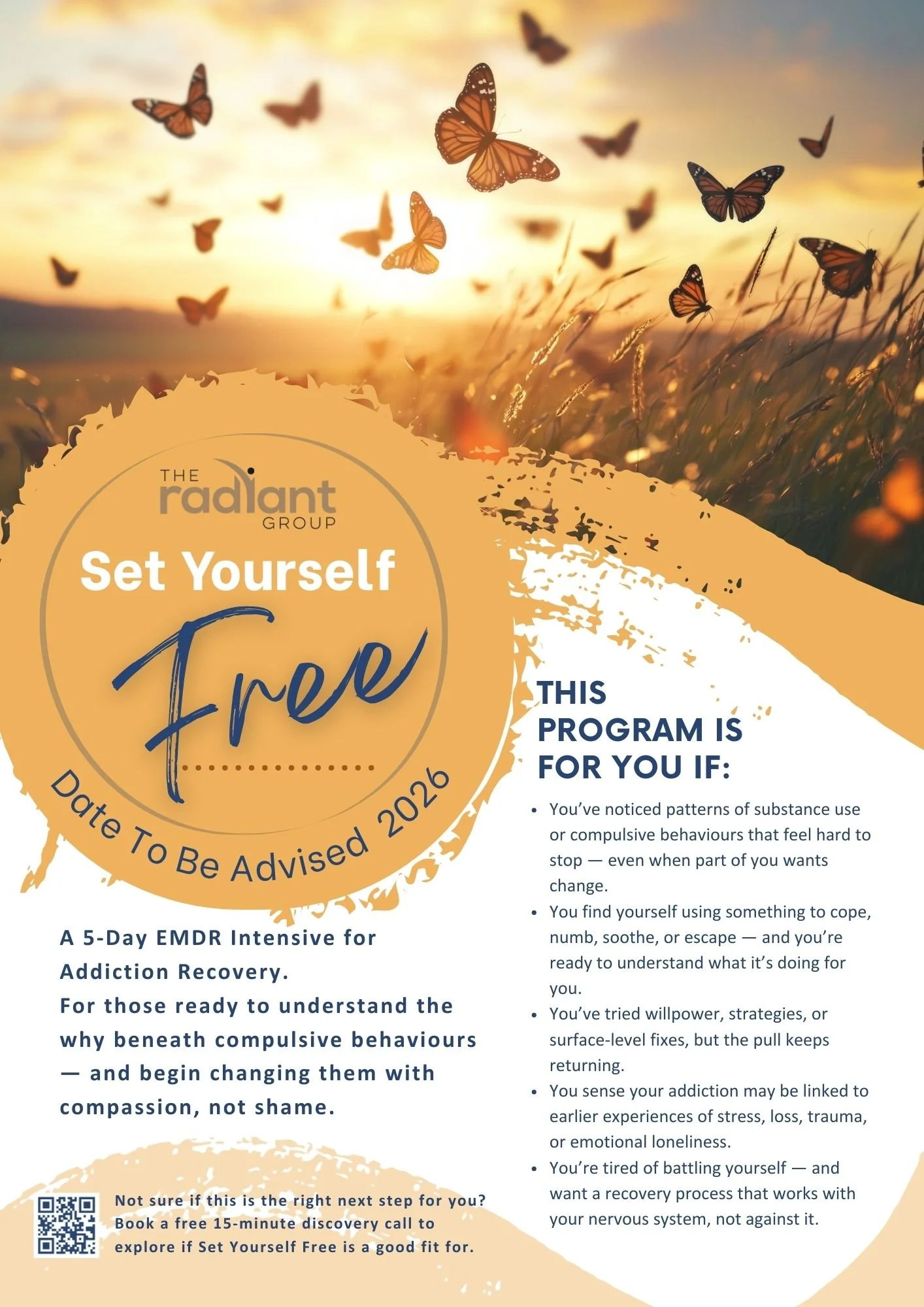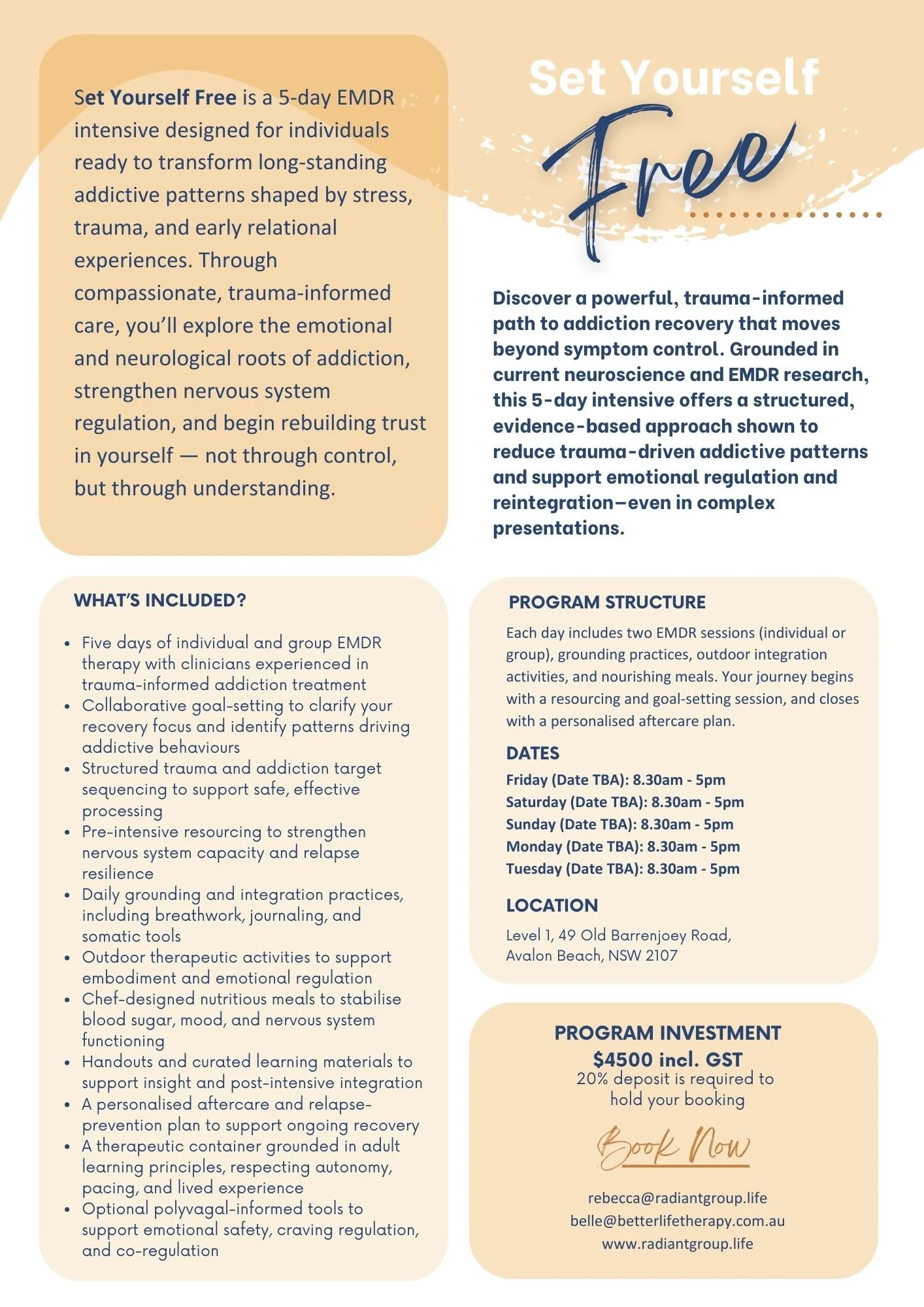 A structured, evidence-based 5-day EMDR intensive supporting recovery from addiction by addressing the underlying trauma, attachment patterns, and nervous system drivers of behaviour. The program integrates focused EMDR processing with stabilisation and integration practices to support meaningful, sustainable change beyond symptom management.