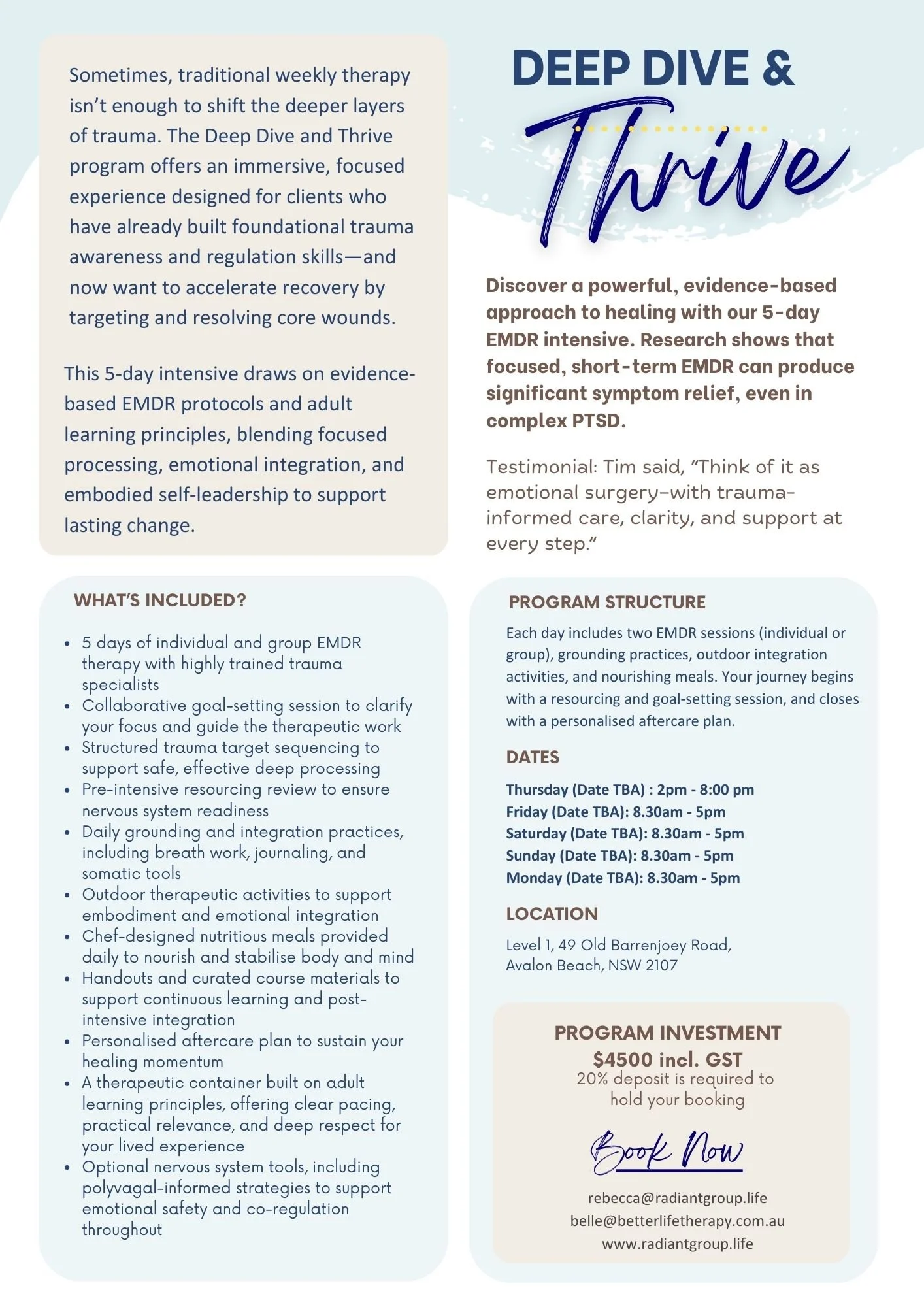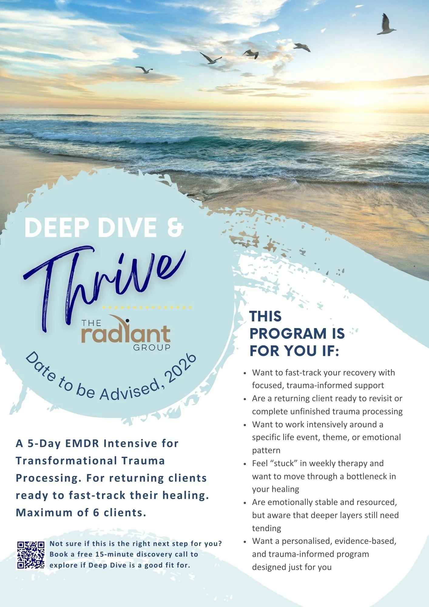 The Deep Dive & Thrive program is a 5-day EMDR intensive designed for existing clients who are ready to take their therapy to the next level. Together, we revisit your trauma map, process unfinished memories, and deepen the healing already begun—helping you break patterns, restore balance, and strengthen resilience for lasting transformation.