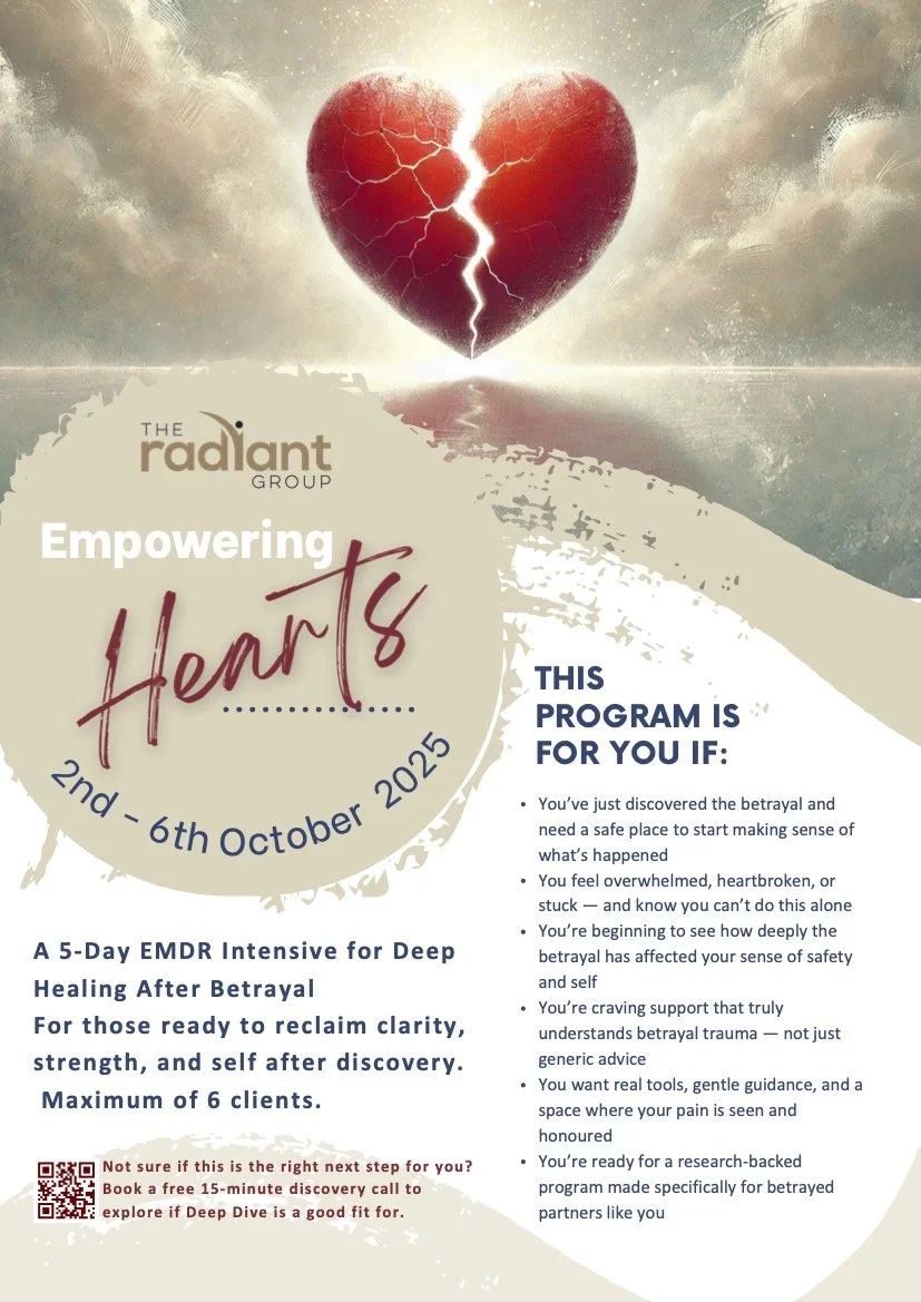 Step into a focused, five-day healing journey designed for those facing betrayal trauma. Through expert guidance, EMDR intensives, and compassionate support, you’ll process deep wounds, restore your sense of self, and reclaim your future. Transform pain into strength in a safe, empowering environment.